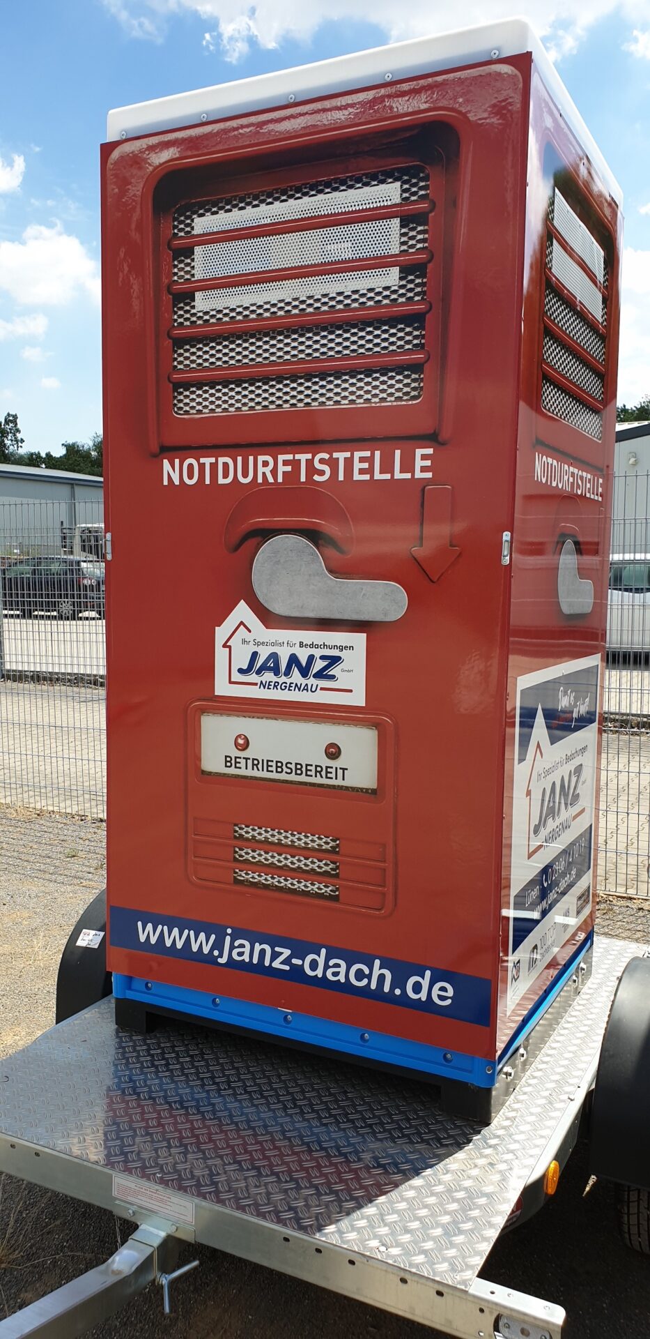 Wir bringen unsere mobile Chemie-Toilette auf dem Anhänger direkt mit. Das spart Zeit und ist für unser Team stets eine saubere Sache!